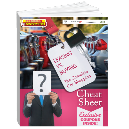 You can download the FREE Leasing vs. Buying: The Complete Car Shopping Cheat Sheet by filling out the form on your right and clicking Download Now. Once you do, you'll receive coupons for $500 off your next new car from Precision CJDR and $250 off any used car from Precision CJDR.Â