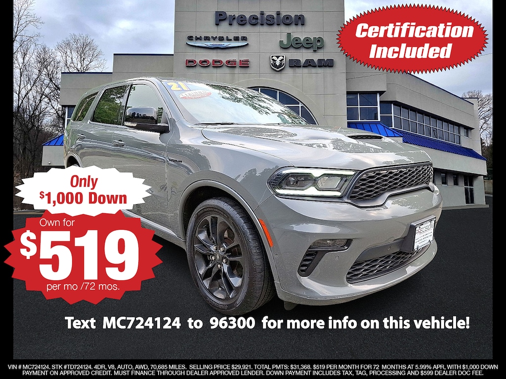 "* DODGE CERTIFIED / CPO WARRANTY * * AWD / All Wheel Drive * * Clean Car Fax * 10.1""Touchscreen Display 2nd Row Fold/Tumble Captain Chairs 2nd Row Mini Console w/Cupholders 2nd Row Seat Mounted Inboard Armrests 3rd Row Floor Mat & Mini Console 3rd row seats: split-bench 6-Passenger Seating Apple CarPlay/Android Auto Blacktop Package Class IV Receiver Hitch Gloss Black Badges Gloss Black Exterior Mirrors GPS Navigation Heated front seats Heated rear seats Heavy-Duty Engine Cooling Navigation system: TomTom Power Liftgate Power Sunroof Quick Order Package 22S Rear Load Leveling Suspension Satin Black Dodge Tail Lamp Badge Trailer Brake Control Trailer Tow Group IV Wheels: 20""x 8.0""Black Noise Aluminum.Destroyer Gray Clearcoat 2021 Dodge Durango R/T HEMI 5.7L V8 Multi Displacement VVT 8-Speed Automatic AWDFCA US LLC Certified Pre-Owned Details: * Roadside Assistance * 125 Point Inspection * Powertrain Limited Warranty: 84 Month/100000 Mile (whichever comes first) from original in-service date * Vehicles Up to 75000 Miles and/or 5 Model Years. 24-Hour Towing & Roadside Assistance Car Rental Allowance CARFAX® Vehicle History ReportTM and an Introductory 3-month Subscription to SiriusXM® Satellite Radio & Certified Warranty Upgrades * Warranty Deductible: $100 * Transferable Warranty * Vehicle History * Limited Warranty: 3 Month/3000 Mile (whichever comes first) after new car warranty expires or from certified purchase date"