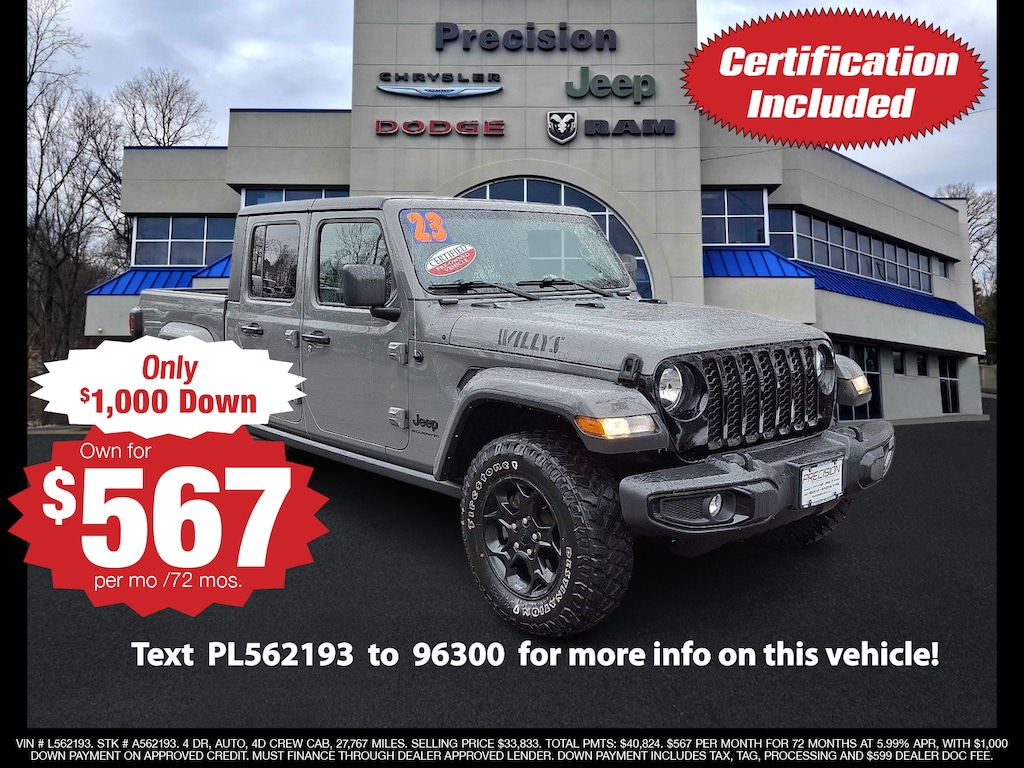 "* JEEP CERTIFIED / CPO WARRANTY * *Remainder Factory Warranty * 4WD / Four Wheel Drive * * One Owner - Clean Car Fax * 4-Wheel Drive Decal 97 MPH Vehicle Max Speed Calibration Air Conditioning w/Auto Temperature Control Anti-Spin Differential Rear Axle Automatic Headlamps Black 3-Piece Hard Top Black Grille Body Color Fender Flares (2-Piece) Cluster 7.0""TFT Color Display Convenience Group Daytime Running Lamp System Deep Tint Sunscreen Windows For More Info Call 800-643-2112 Freedom Panel Storage Bag Front 1-Touch Down Power Windows Front Door Locks 2-Door Passive Entry Front Heavy Duty Red Accent Shock Absorbers GPS Antenna Input Integrated roll-over protection Mold In Color Bumper w/Gloss Black MOPAR All-Weather Slush Mats ParkView Rear Back-Up Camera Power Heated Mirrors Power Tailgate Lock Premium Wrapped Steering Wheel Protection Sill Rails Quick Order Package 24W Willys Rear Heavy Duty Red Accent Shock Absorbers Rear Sliding Window Rear Window Defroster Remote Keyless Entry Security Alarm SiriusXM Radio Service SiriusXM Satellite Radio Speed Sensitive Power Locks Steering wheel mounted audio controls Sun Visors w/Illuminated Vanity Mirrors Technology Group Universal Garage Door Opener Wheels: 17""x 7.5""Black Aluminum Willys Willys Hood Decal.Sting-Gray Clearcoat 2023 Jeep Gladiator Willys 3.6L V6 24V VVT 8-Speed Automatic 4WDFCA US LLC Certified Pre-Owned Details: * Vehicles Up to 75000 Miles and/or 5 Model Years. 24-Hour Towing & Roadside Assistance Car Rental Allowance CARFAX® Vehicle History ReportTM and an Introductory 3-month Subscription to SiriusXM® Satellite Radio & Certified Warranty Upgrades * Vehicle History * Transferable Warranty * 125 Point Inspection * Powertrain Limited Warranty: 84 Month/100000 Mile (whichever comes first) from original in-service date * Roadside Assistance * Limited Warranty: 3 Month/3000 Mile (whichever comes first) after new car warranty expires or from certified purchase date * Warranty Deductible: $100"