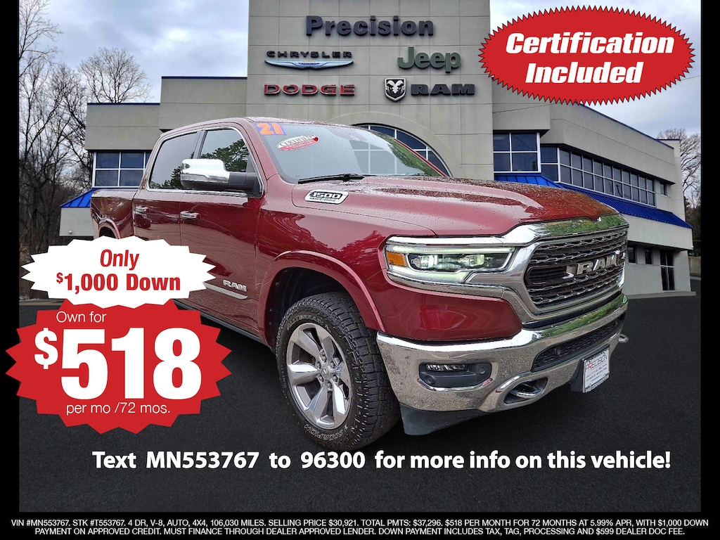 "* RAM CERTIFIED / CPO WARRANTY * 4WD / Four Wheel Drive * * Clean Car Fax * * Panoramic Moonroof / Sunroof * Uconnect 12.0Inch Display with Navigation 1-Yr SiriusXM Guardian Trial 12""Touchscreen Display 4G LTE Wi-Fi Hot Spot Adjustable pedals Apple CarPlay Apple CarPlay/Android Auto Auto-leveling suspension Automatic temperature control Disassociated Touchscreen Display Dome Dual LED Reading Lamp Dual-Pane Panoramic Sunroof For More Info Call 800-643-2112 Genuine wood console insert Genuine wood dashboard insert Genuine wood door panel insert Google Android Auto GPS Antenna Input GPS Navigation HD Radio Heated door mirrors Heated front seats Heated rear seats Heated steering wheel Integrated Center Stack Radio Integrated Voice Command w/Bluetooth LED Dome/Reading Lamp Memory seat Navigation System ParkView Rear Back-Up Camera Pedal memory Power driver seat Premium Leather Trimmed Bucket Seats Quick Order Package 27M Limited Radio: Uconnect 12 w/Navigation Rear step bumper Remote keyless entry SiriusXM Radio Service SiriusXM Satellite Radio SiriusXM Traffic Plus SiriusXM Travel Link SiriusXM w/360L Steering wheel mounted audio controls Trailer Brake Control USB Host Flip Ventilated front seats Wheels: 20""x 9""Polished w/Inserts.Delmonico Red Pearlcoat 2021 Ram 1500 Limited HEMI 5.7L V8 Multi Displacement VVT 8-Speed Automatic 4WDCertified Pre-Owned Go Details: * Limited Warranty: 3 Month/3000 Mile Runs From the Date of the CPOV Sale or at the expiration of the remaining 3/36 Basic New Vehicle Warranty (whichever is more beneficial to the customer) * Vehicle History * Roadside Assistance * Warranty Deductible: $100 * 125 Point Inspection * Vehicles Between 6-10 Model Years and/or 75001-120000 Miles. Thorough Reconditioning Process Using Authentic Mopar Parts. 3-Month Trial Subscription for SiriusXM GuardianTM and Satellite RadioAwards: * Motor Trend Automobiles of the year * JD Power Automotive Performance Execution and Layout (APEAL) Study"